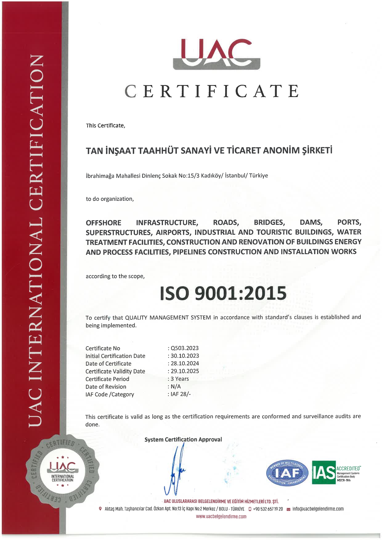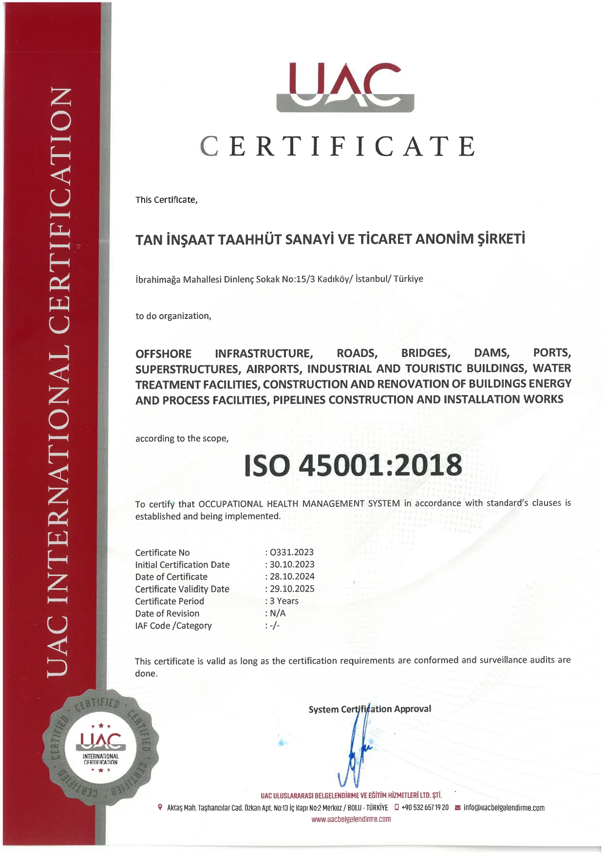 TAN Construction has ISO and OHSAS Management System Certificates and continues its activities under an integrated management system.