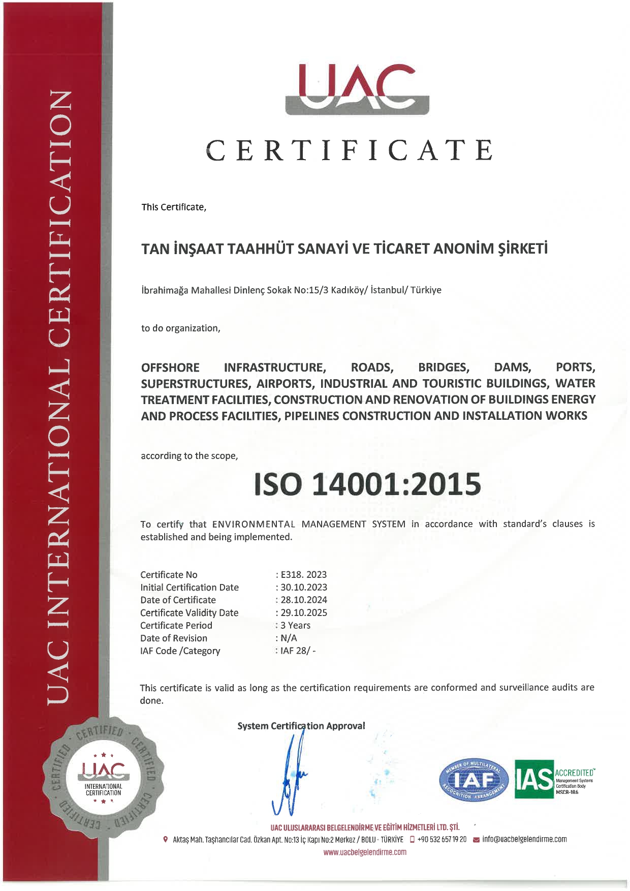 TAN Construction is a company with ISO 14001-2015 Environmental Management System Certificate, which strives to achieve and pay attention to an excellent environmental performance by controlling the effects of its activities on the environment, in line with its environmental policy and targets.